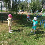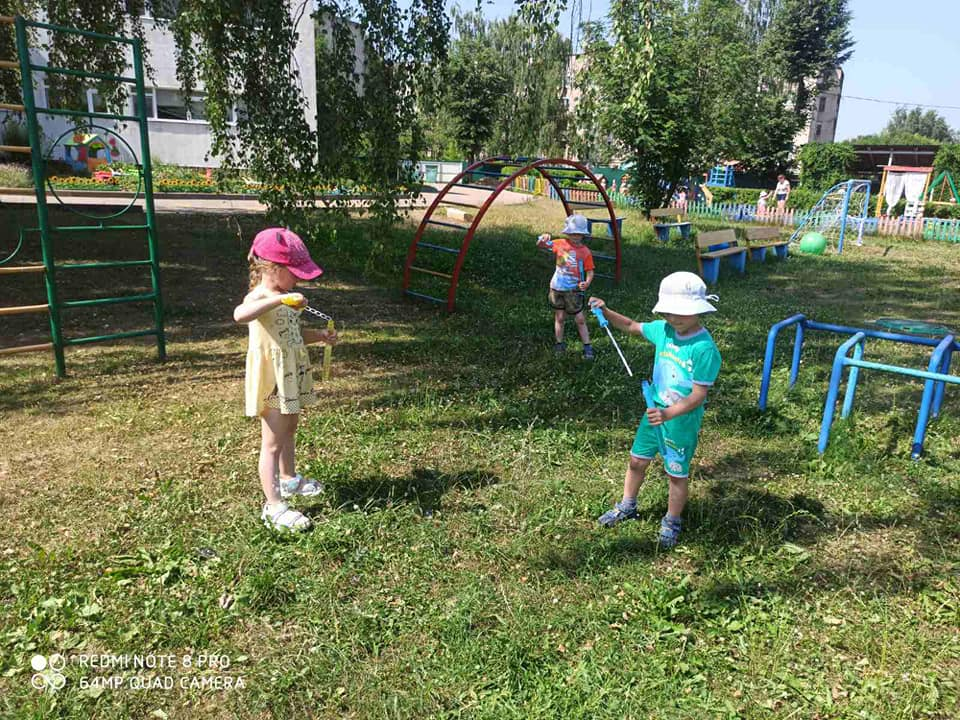 Сначала веселый хоровод под прысканье множества пульверизаторов. Педагоги, в две руки каждый, создавали супермелкий дождик над головами танцующих детей. Смешно и неожиданно это было. А потом все разошлись по водным интересностям. Водные бомбочки, прицельная стрельба из водных пистолетов, выстрелы водой вверх из помпы, мыльные пузыри, мокрое рисование, музыка воды.