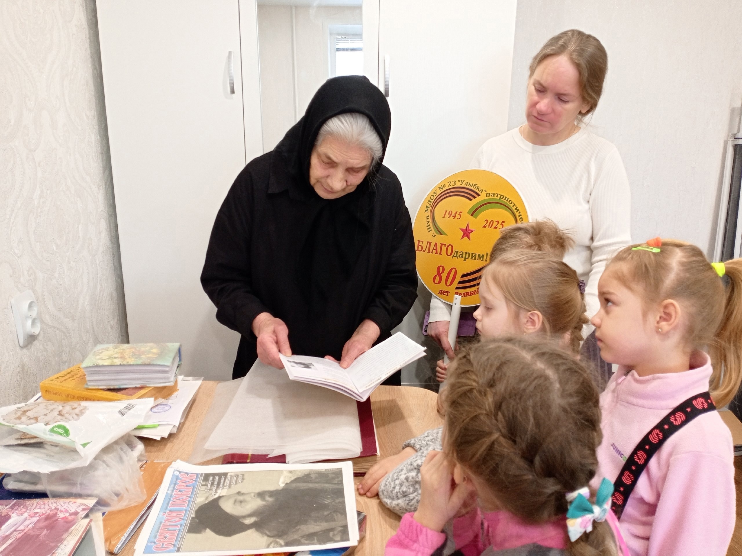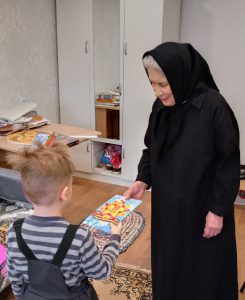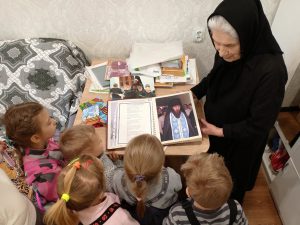 14 февраля ребята из группы «Сказка» посетили мать Нионеллу. Она не застала военное время, но очень интересно рассказала детям о послевоенных годах. Вспомнила, какие игрушки делали в то время, как помогали взрослым и учились в школе. Также матушка с удовольствием рассказала о том, как дети любили играть в «войнушку», в которой всегда побеждала наша армия. После школьных занятий ребята ходили к пожилым людям и учили их читать и писать.