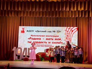 Коллективу нашего детского сада выпала честь открывать фестиваль. Музыкальная композиция «Родина — мать моя, ты гордость и сила» рассказала зрителям о нелегкой судьбе солдатских матерей и о том, что у каждого воина во все времена есть опора и сила — это Родина.