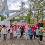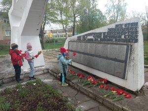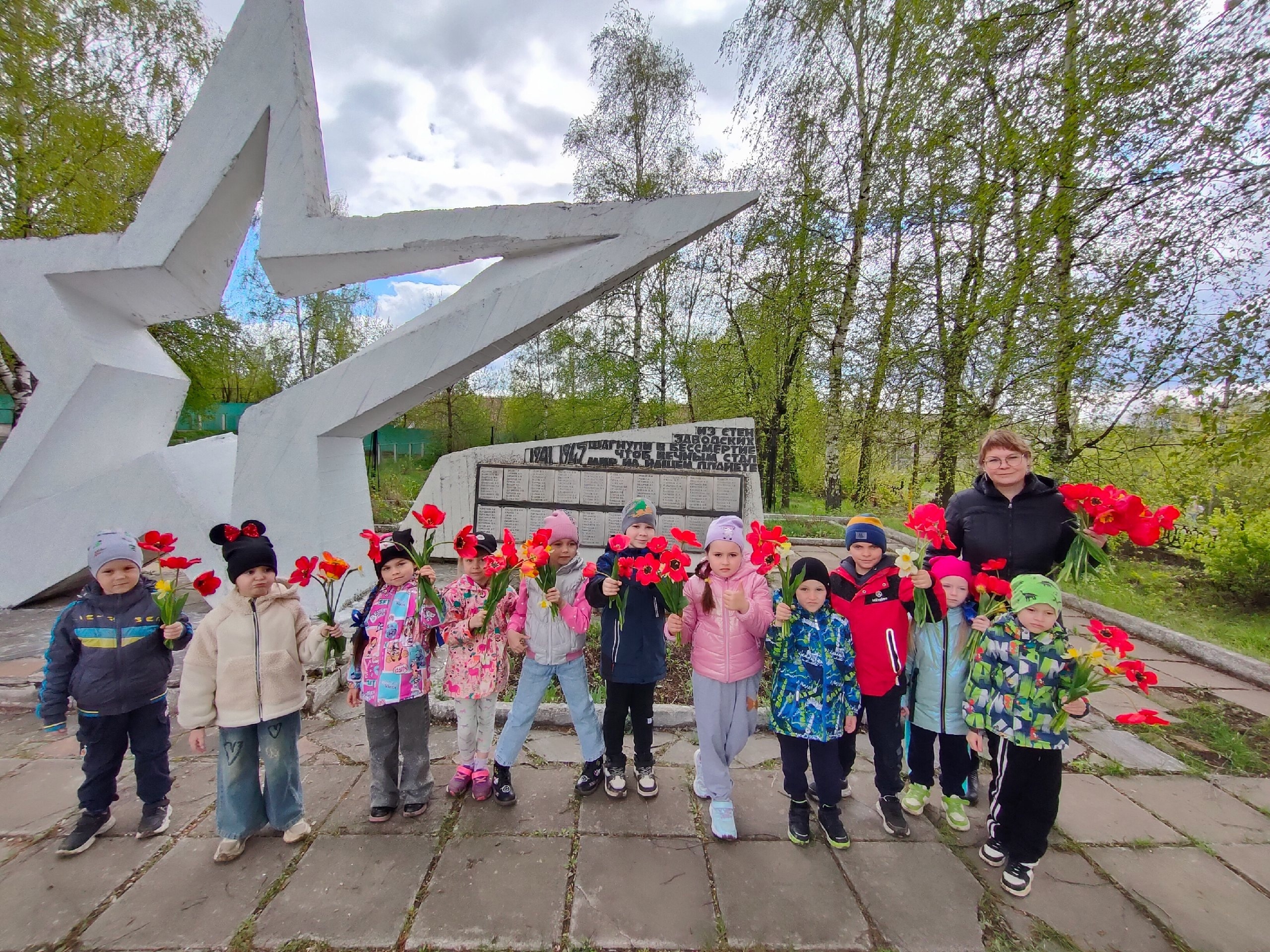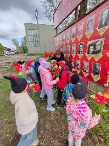 Затем ребята отправились за пределы детского сада и возложили цветы к мемориалу памяти погибших в Великой Отечественной войне работников завода им. Фрунзе на 1-й Нагорной улице. Ещё раз поговорили об истории нашей страны, о тех героях, которые не вернулись с войны.